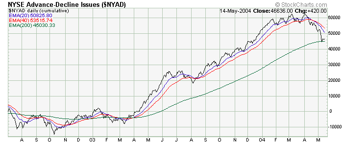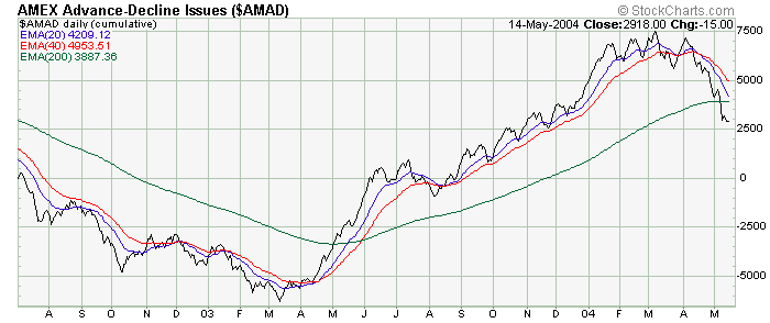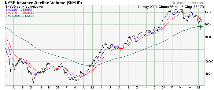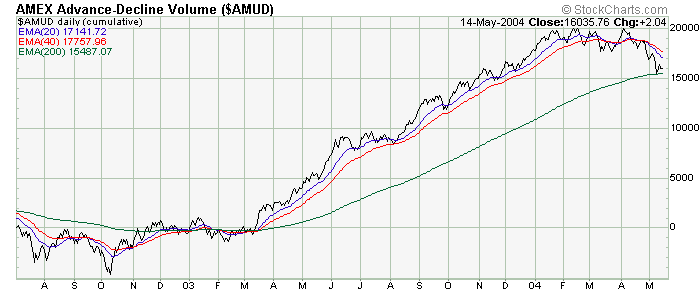 The bad news for the bulls now is that the breadth NYSE McClellan Summation Index has now been able to take out it's October 2002 lows suggesting, minimally speaking, that a more pronounced intermediate term correction is indeed underway. On the other hand, the volume MCSUM has not done the same thing, and continues to look constructive.
