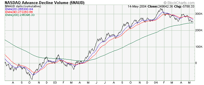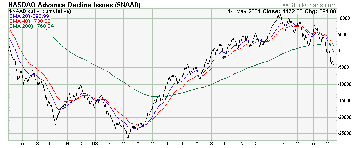 Like price, the cumulative charts are also playing tag with their own 1% trends (200 day EMA's), with the NASDAQ market looking rather weak as far as overall investor participation.